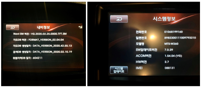 왼쪽이 업데이트 후 내비 버전 정보화면이고 오른쪽이 업데이트 전 시스템 정보 화면이다...