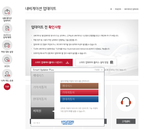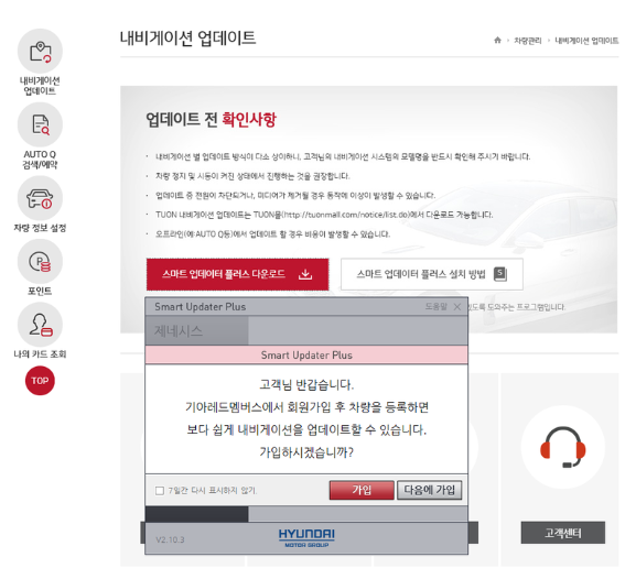 회원가입후 상위 메뉴 중 '차량관리' - '네비게이션 업데이트'로 이동하여 해당 링크를 클릭한다.