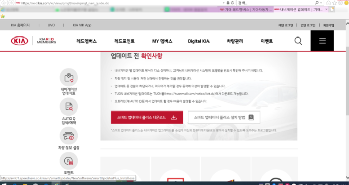 기아 레드 맴버스 홈페이지에서 업데이트 방법을 누르면(왼쪽) 오른쪽 화면을 볼 수 있는데 업데이트 다운로드라는 곳에서 아래 붉은색 칸에 있는 것처럼 안내가 붙어 있다